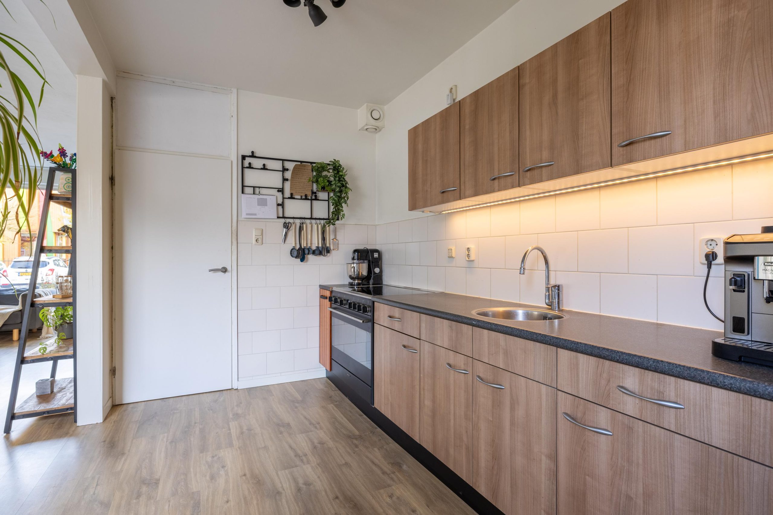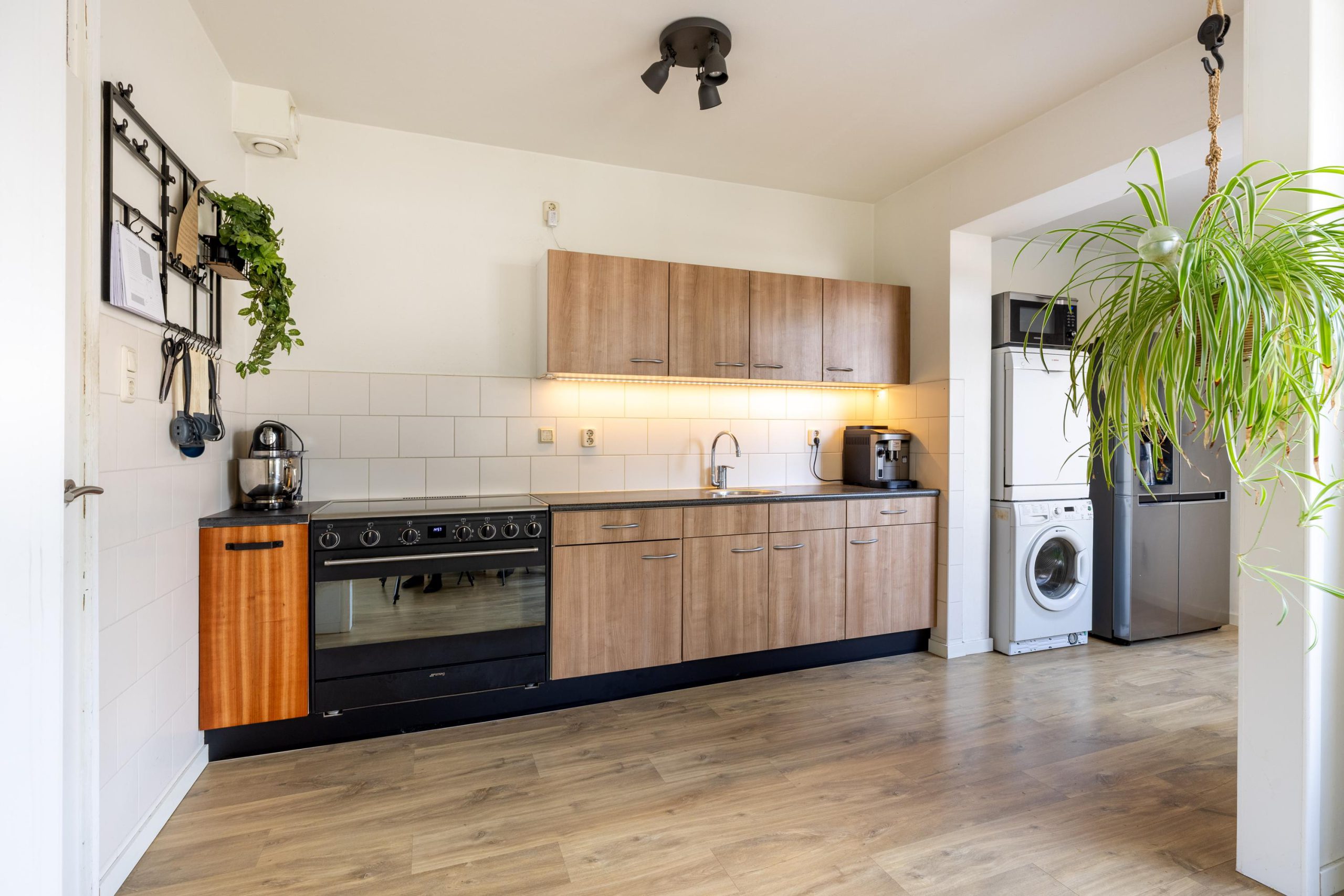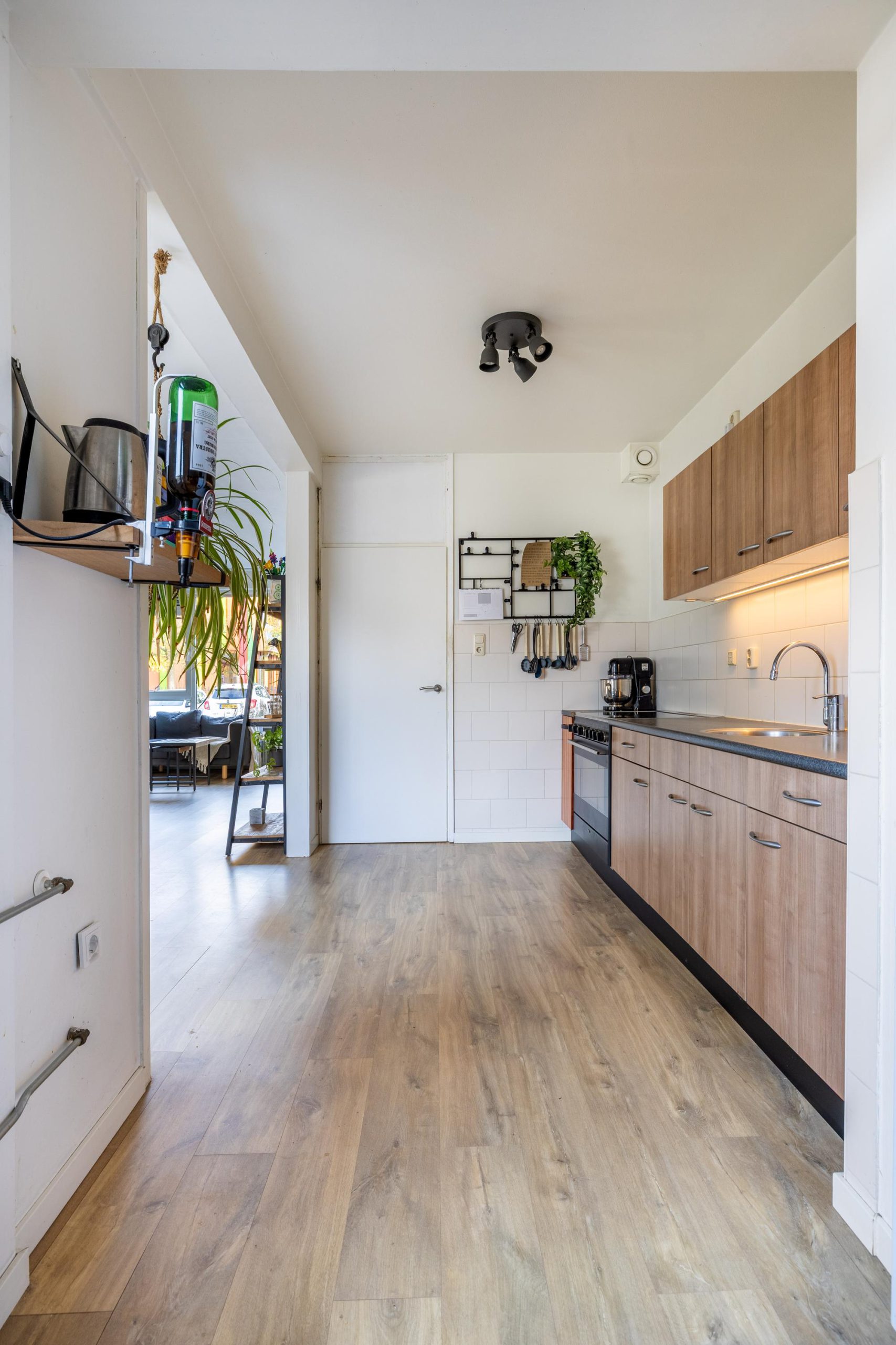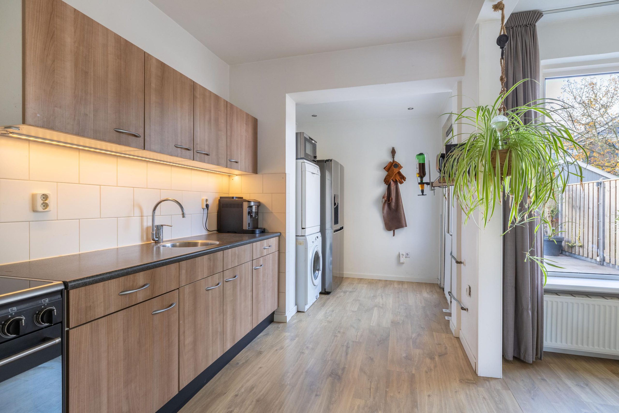 De keuken vormt één geheel met de woonkamer en voelt extra ruim doordat de voormalige bijkeuken is weggehaald. Hierdoor heb je niet alleen meer opbergruimte en werkruimte, maar ook veel meer bewegingsvrijheid. De warme houttinten geven de keuken een moderne en rustige uitstraling. Vanuit hier loop je zo de tuin in.
